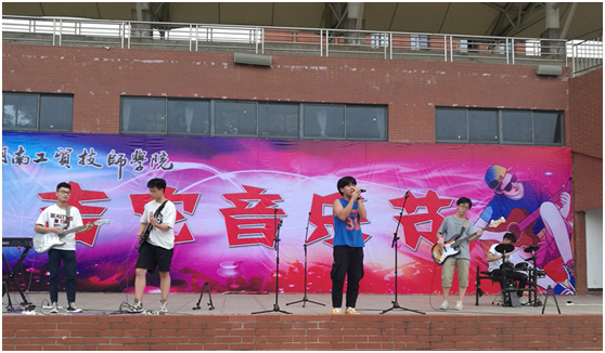 下午1430,近600名学生齐聚运动场,一同享受这场音乐盛会。魏古同学以一首实力超群、深情十足的独唱《春风十里》拉开了本次音乐节的序幕。我院的稻草人乐队活力四射,乐控力十足,为大家带来了多首激情四溢的歌曲。湖南有色职院的不倒翁乐队、湖铁科职院的拖鞋配球服乐队以及化工职院和湖南中医药学校的七分裤乐队也纷纷给力献唱。
