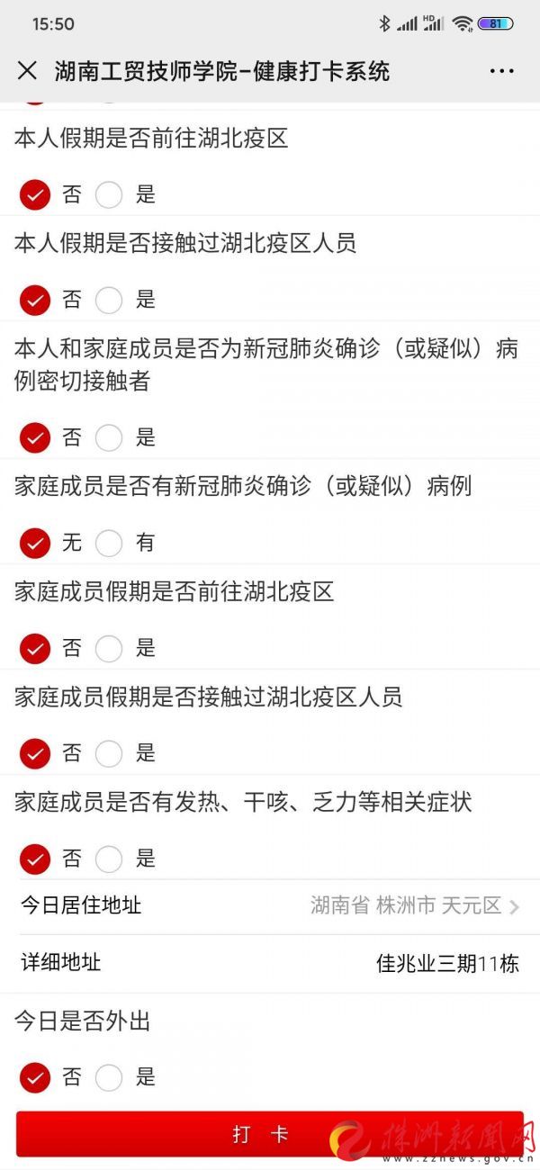 株洲新闻网3月4日讯(记者 文樱 通讯员 韩超平)为了对学校教职员工和学生进行全覆盖排查,实行“日报告、零报告”,掌握全校师生员工的健康情况,日前,九州网页版创新防疫工作机制,在九州网页版微信公众号开设了“防疫登记”专栏,专门用于全体教职工和学生疫情防控期间的健康监测,扎实精准推进疫情防控工作。
