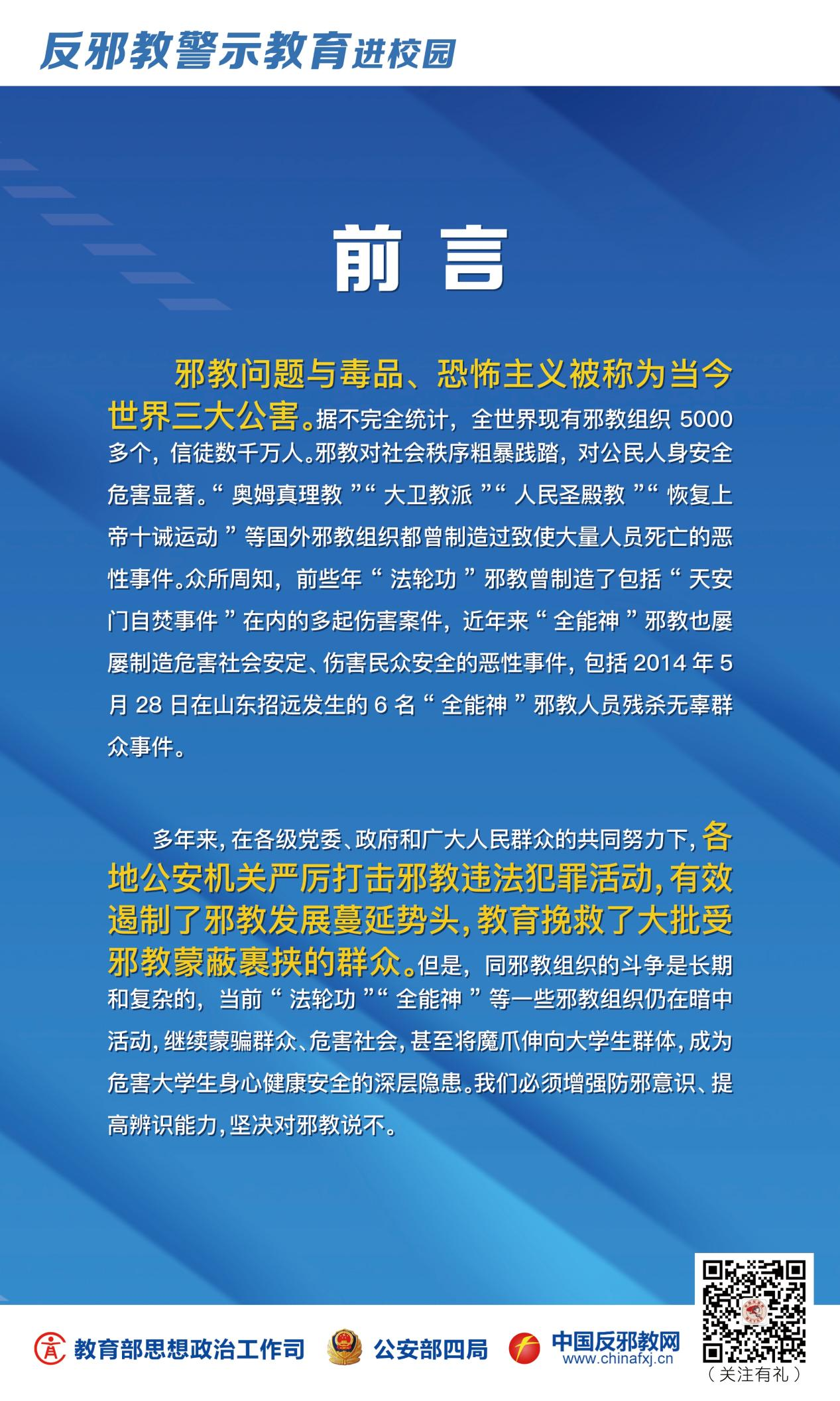 2021年4月15日是第六个“全民国家安全教育日”,九州网页版邀您一起参与“对邪教说不”活动,大家可以关注“中国反邪教”微信公众号,点击“我要签名”栏目,登录后参加“对邪教说不”签名、反邪教知识答题、反邪教趣味小游戏、反邪教资料宣传和抽奖活动,让我们通过此次活动的开展,增强国家安全意识,提高反邪教意识和能力,真正成为“总体国家安全观”的践行者。