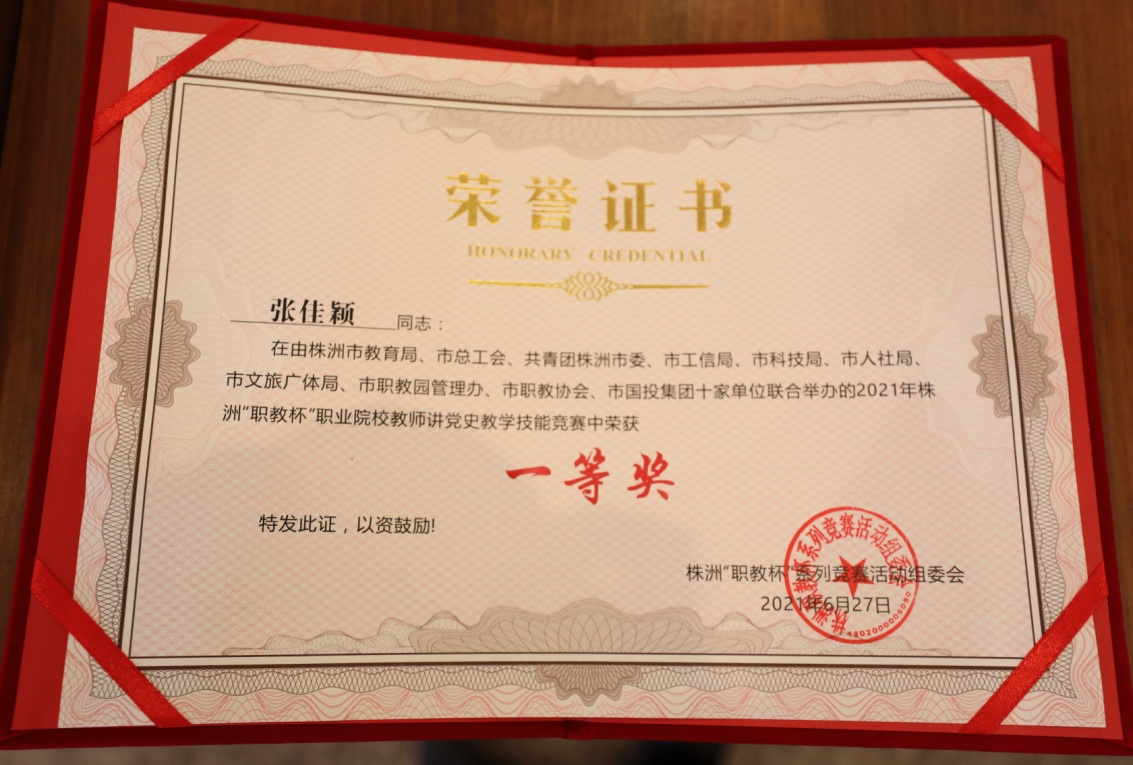 6月27日,在2021年株洲“职教杯”职业院校教师讲党史教学技能竞赛中,九州网页版建筑装饰系教师张佳颖荣获一等奖,并被授予株洲市“五一劳动奖章”。