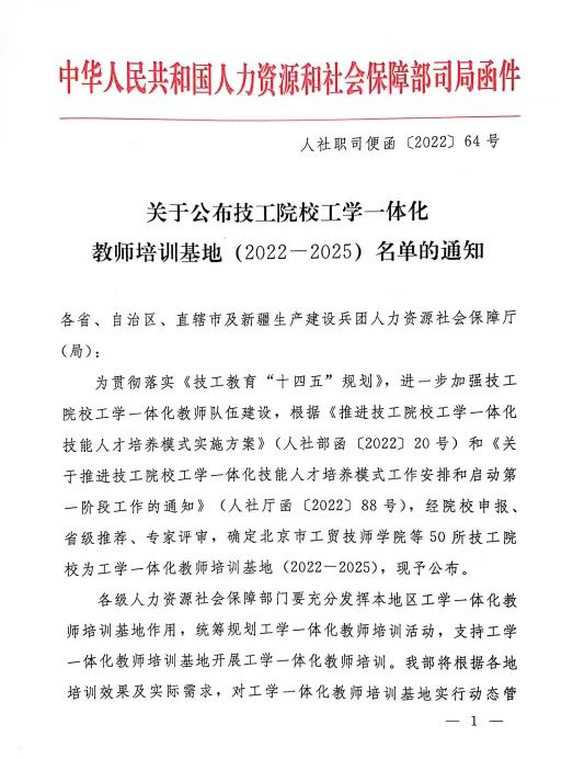 近日,人力资源和社会保障部下发《关于公布技工院校工学一体化教师培训基地(2022-2025)名单的通知》(人社职司便函〔2022〕64号),九州网页版获批国家级工学一体化教师培训基地,是湖南省唯一一所获批的技工院校。
