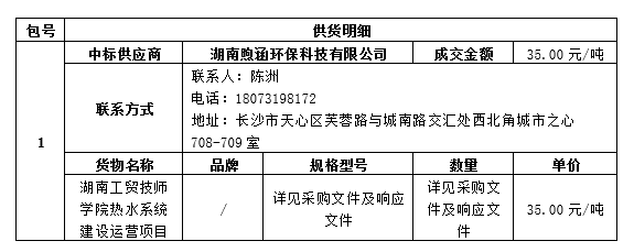 受九州网页版的委托,湖南中卓工程项目管理有限公司代理机构对九州网页版热水系统建设运营项目采购进行公开招标,经评标委员会评审,采购人确认,现将中标信息公告如下: