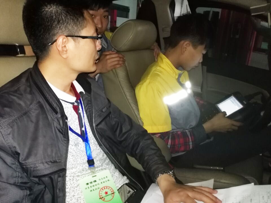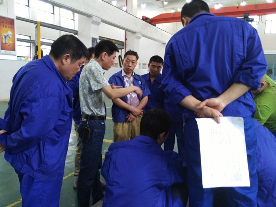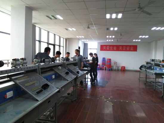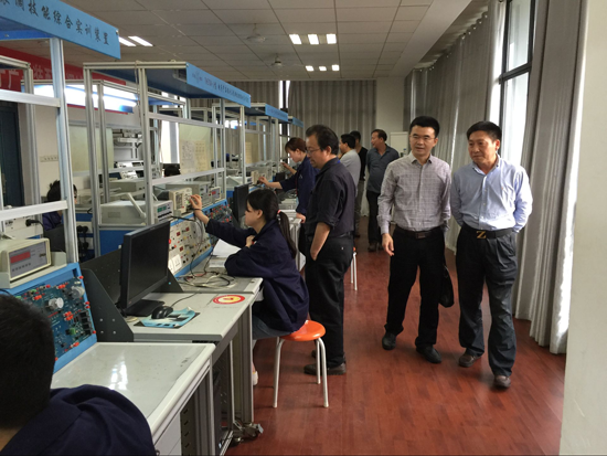 吴开明主任(右二)在张格林书记(右一)的陪同下对维修电工鉴定工作进行参观指导