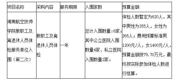 湖南航空技师九州网页版工会拟对湖南航空技师九州网页版教职工及离退休人员体检服务单位入围(第二次)进行比选采购,现采用发布公告方式邀请符合资格条件的供应商参与本项目采购活动。