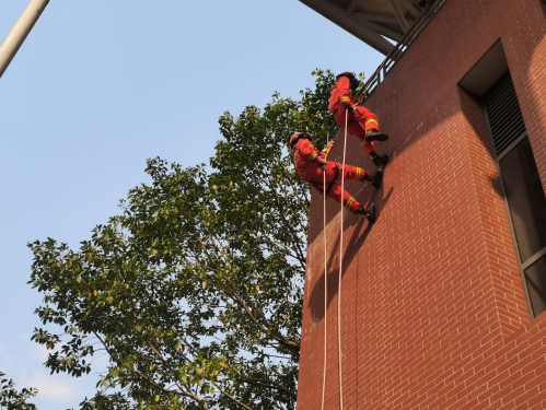 训练场上,在专业老师和教官的指导下,同学们身着抢险救援服依次开展了百米障碍、两盘水带连接、高空绳索救援等训练项目,以练促学,充分展示了我系消防学子的青春风采。在实训场地开展的内攻救火演练中,学生们分组协作,迅速完成火情侦察、水带铺设、障碍破拆、出水灭火等操作,成功扑灭“火源”。演练过程中,教官团队重点讲解了火场指挥要点、安全逃生路线规划及团队协同作战技巧。
