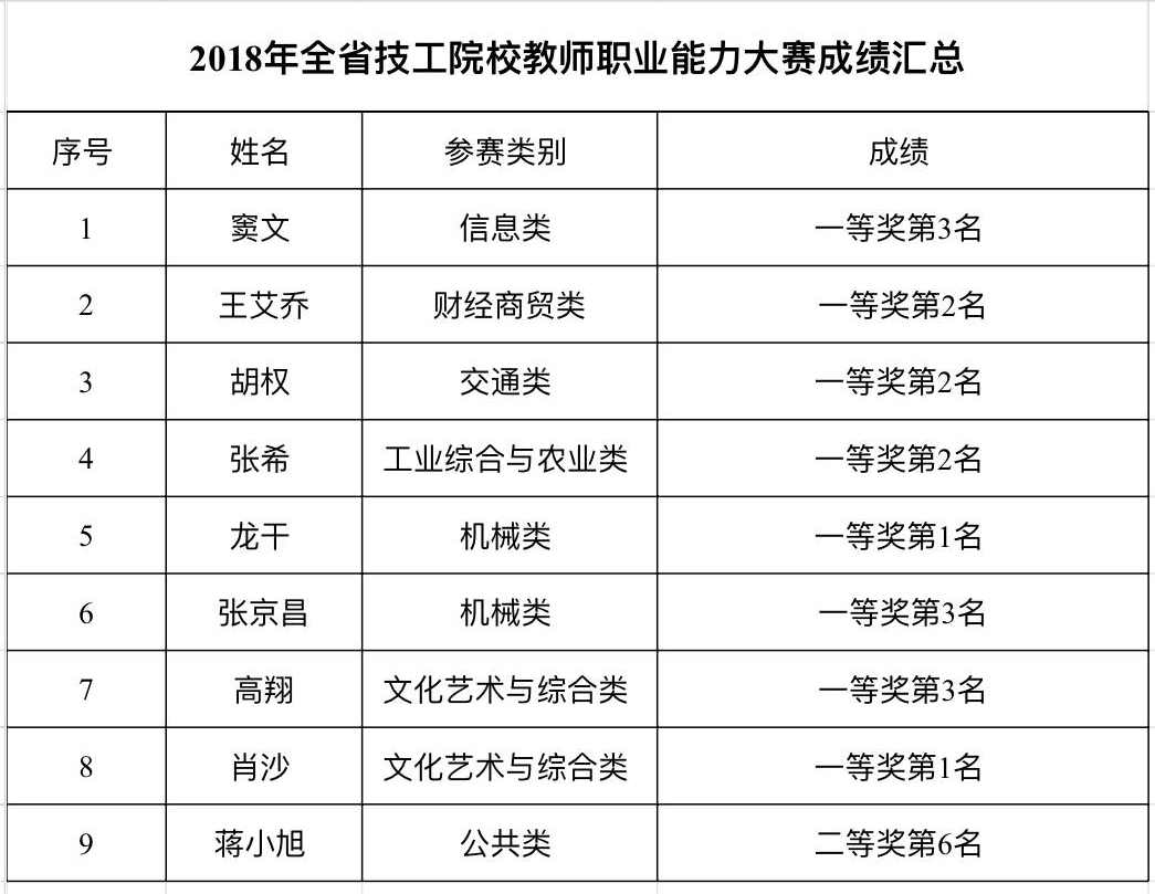 本次大赛由省人力资源和社会保障厅主办,共有来自全省14个市州的230名选手参加了7大类比赛。我院共选派10名优秀青年教师参加了6个大类比赛,共获得8个一等奖,1个二等奖,其中肖沙获文化艺术与综合类第1名,龙干获机械类第1名,这两位教师也将代表我省向国赛发起冲刺。(党政办 供稿)